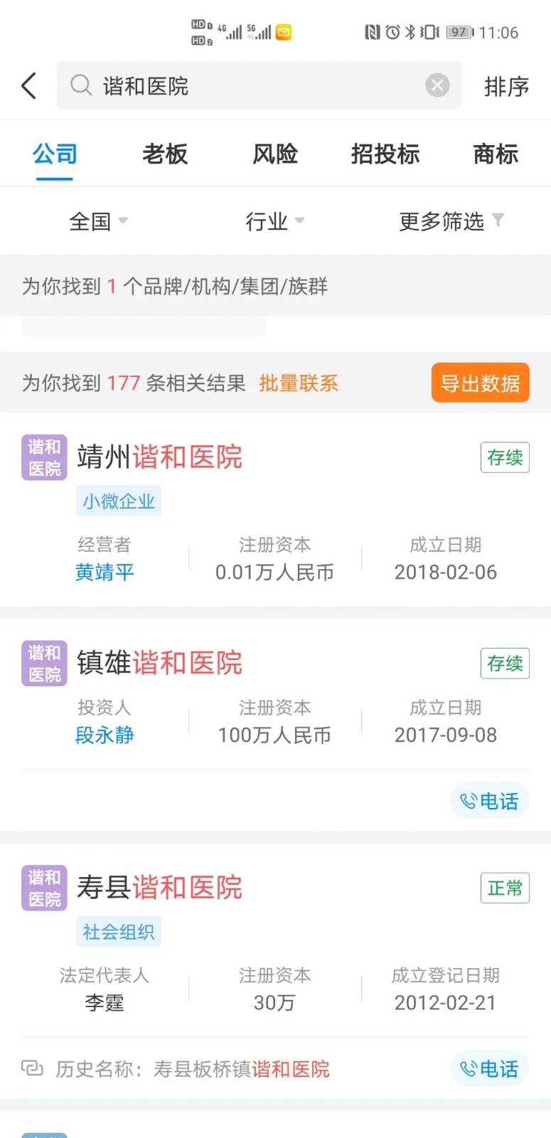 在天眼查上搜索到的“谐和”字号相关的医疗机构有上百家。(网页截图)