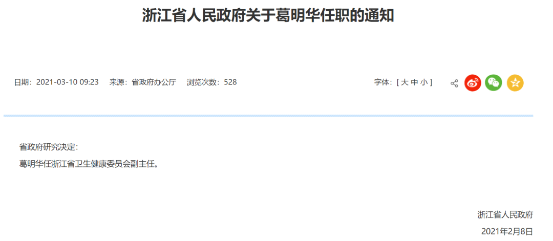 3月10日,浙江省政府官网发布了一则人事任命:葛明华任浙江省卫生健康委员会副主任。