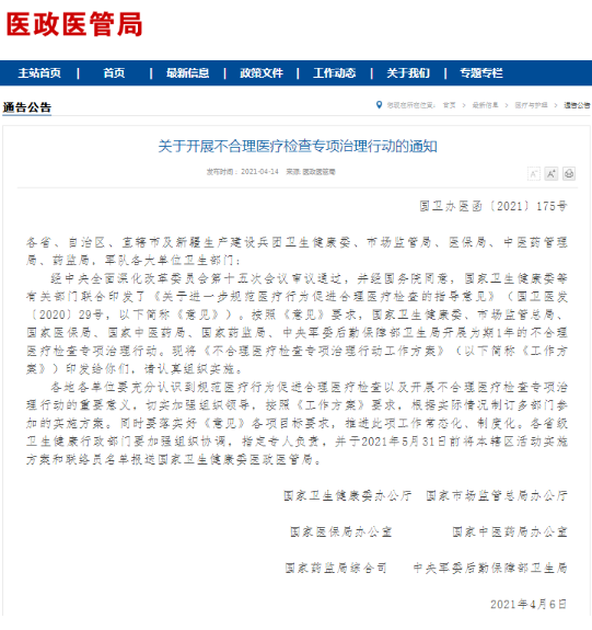 4月14日,国家卫健委官网发布《关于开展不合理医疗检查专项治理行动的通知》,开展新一轮查处行动,严肃查处违反相关法律法规、诊疗技术规范的不合理医疗检查(包括各类影像学检查、实验室检查、病理学检查等)。