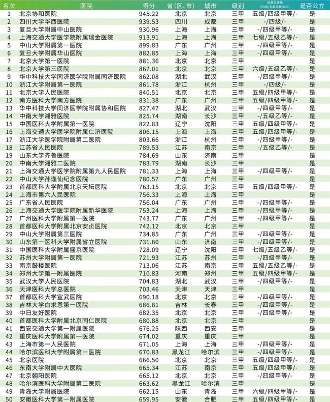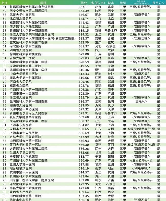 在这次的中国顶级医院100强名单中,复旦大学附属华山医院、华中科技大学同济医学院附属同济医学院和华中科技大学同济医学院附属协和医院都在前20名中,分别排名第6名、第9名、 第13名。