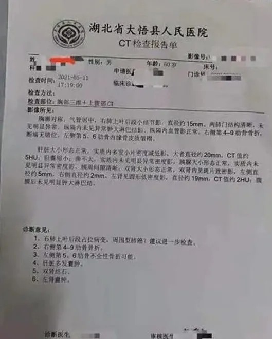 据悉,湖北省孝感市大悟县一名村民在该县中医院办理残疾证明的途中,遭到医院工作人员殴打至全身多根肋骨骨折。对此,大悟县中医院的相关负责人称,系患者先抡起椅子打伤了医院的医生,医院工作人员才将他“控制住”的。今年5月11日,60岁的患者严勇(化名)在妻子的陪伴下,去大悟县中医院精神科企图把2015年,脑溢血手术后,出现后遗症办理的三级残疾证改成二级残疾证。但该院的胡医生经过一系列鉴定后,认为严勇无肢体瘫痪和残疾,精神方面也很正常,不符合办理二级残疾证的要求,便拒绝了严勇的诉求。遭到拒绝后的严勇,心生不快,便拿起旁边的塑料凳子砸向胡医生,胡医生伸手未挡住,他头部被椅子擦伤。据严勇妻子称:“胡某抓伤了严勇,随后医院的其他员工赶到,在大厅内将严勇摁倒地上殴打。在民警赶到后,她将严勇送到了大悟县医院救治。”据大悟县人民医院CT报告显示,严勇右侧第4-9肋骨骨折;左侧第5、6肋骨不全性骨折可能;同时,还发现他出现肺部占位,怀疑周围型肺癌。