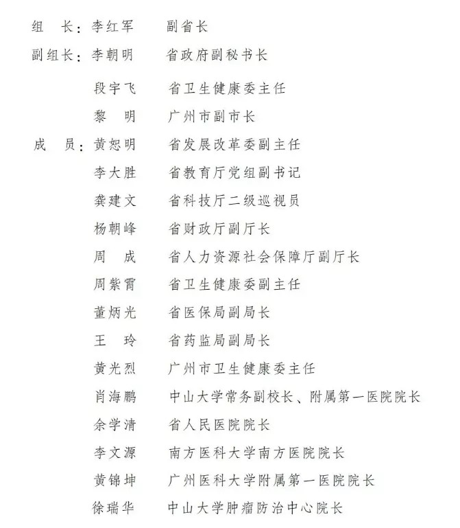 据悉,领导小组由广东省副省长李红军担任组长,省政府副秘书长李朝明、省卫生健康委主任段宇飞、广州市副市长黎明担任副组长,小组成员包括省发改委、省教育厅、财政厅、人社厅、省卫健委、省医保局、省药监局等省级领导,以及广州市卫健委、广州市多家顶级三甲医院院长等。