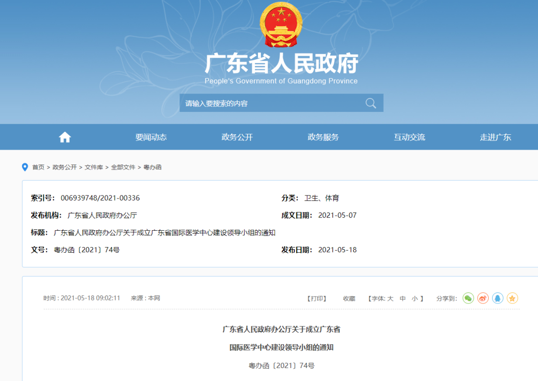 5月18日,广东省人民政府印发《关于成立广东省国际医学中心建设领导小组的通知》,为进一步推进广东省国际医学中心和高水平医院建设工作,省政府决定成立广东省国际医学中心建设领导小组(以下简称领导小组)。