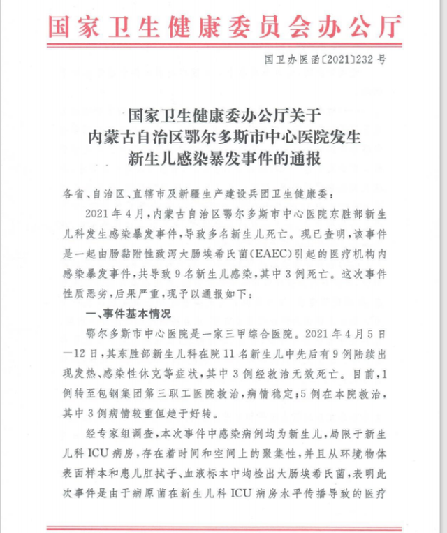 2021年4月,内蒙古自治区鄂尔多斯市中心医院东胜部新生儿科发生感染暴发事件,导致多名新生儿死亡。现已查明,该事件是一起由肠黏附性致泻大肠埃希氏菌(EAEC)引起的医疗机构内感染暴发事件,共导致9名新生儿感染,其中3例死亡。这次事件性质恶劣,后果严重,现予以通报如下: