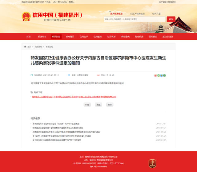 据信用中国(福建福州)网站5月25日消息,福建省福州市永泰县卫健局近日作出《转发国家卫生健康委办公厅关于内蒙古自治区鄂尔多斯市中心医院发生新生儿感染暴发事件通报的通知》。