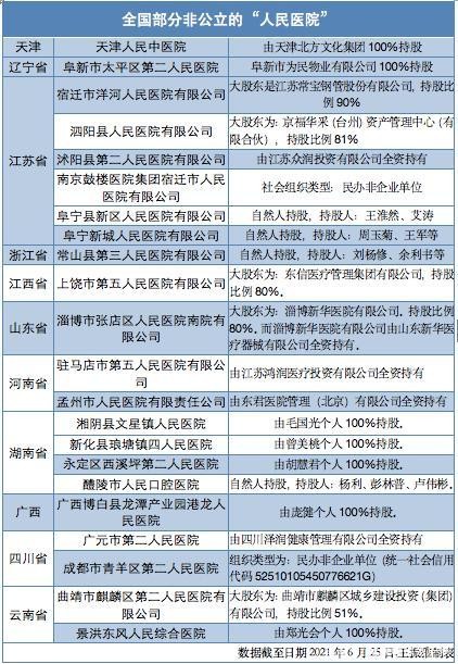 据天眼查数据显示,天津人民中医院、宿迁市洋河人民医院、沐阳县第二人民医院有限公司等21家“人民医院”均为民营性质的非公立医院。