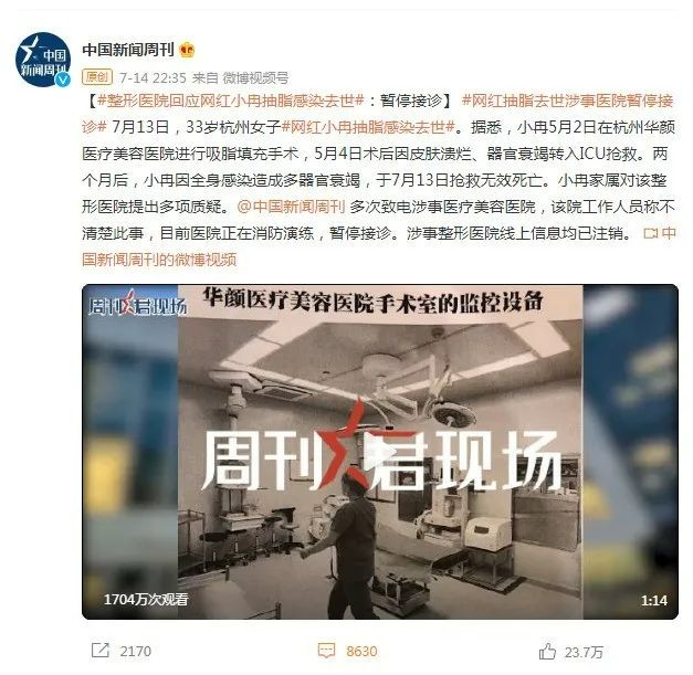 另据观察网报道,33岁杭州女子网红小冉5月2日在杭州华颜医疗美容医院进行吸脂填充手术,5月4日术后因皮肤溃烂、器官衰竭转入ICU抢救。两个月后,小冉因全身感染造成多器官衰竭,于7月13日抢救无效死亡。小冉家属对该整形医院提出多项质疑。杭州市西湖区卫健局也已介入调查处理此事。