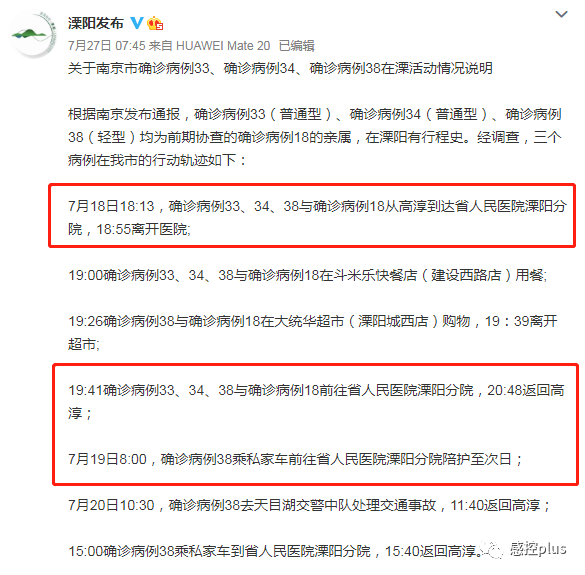7月22日,江苏溧阳发布南京一名阳性(确诊患者18)患者行动轨迹,期间值得关注的是患者一行五人曾两次到医院探视,停留时间分别为四十分钟和六十分钟。