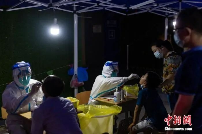 7月28日,南京街头一处核酸检测点,医务人员在夜色中为市民进行核酸检测取样。中新社记者 泱波 摄