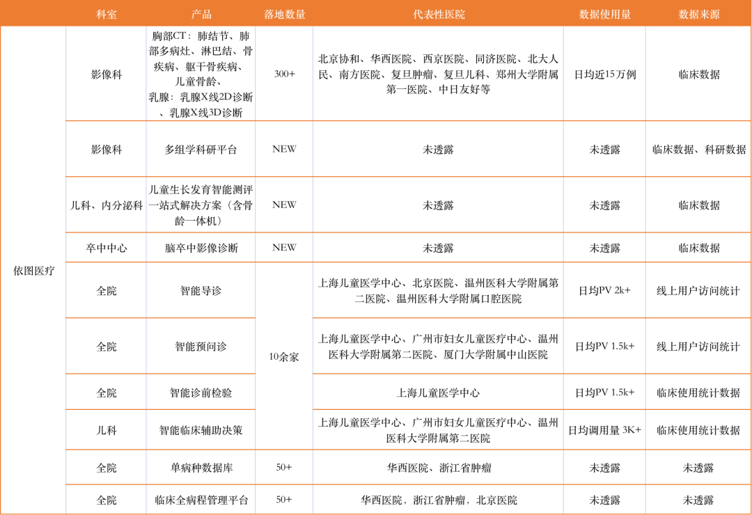 相比之下,依图医疗虽同样拥有肺结节、肺炎等大通量AI产品,但从2019年后的调查数据来看,2019年后的依图医疗更加注重专科领域的发展,重点突击乳腺、儿科方向,其儿童手部X射线影像骨龄辅助评估软件于2021年3月获NMPA批准。同时,依图医疗在基于NLP技术的智能预问诊、智能导诊、智能临床辅助决策等方面与国内多家大型医院都有深度合作与探索。
