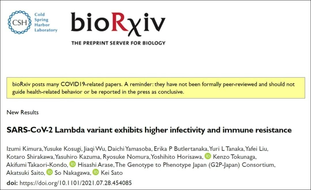 2021年7月28日,东京大学的研究人员在预印本 bioRxiv 发表了题为:SARS-CoV-2 Lambda variant exhibits higher infectivity and immune resistance 的论文,该研究利用分子系统发育分析揭示了拉姆达突变株的进化特征,并指出拉姆达突变株具有更强的传染性和免疫抵抗力。