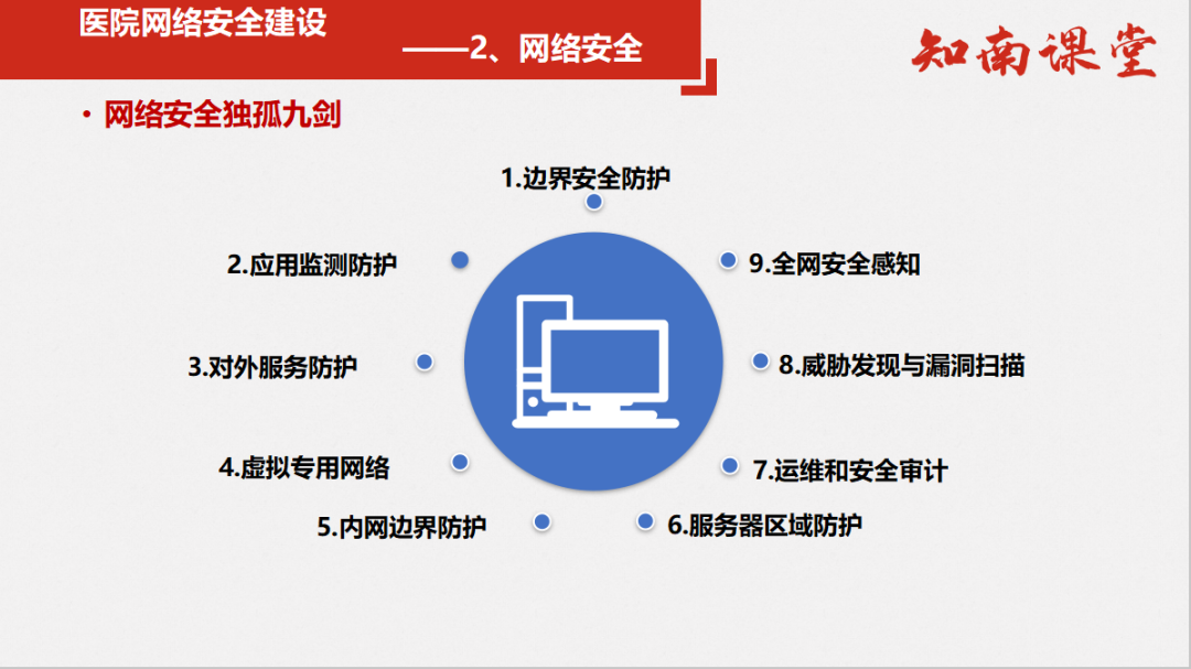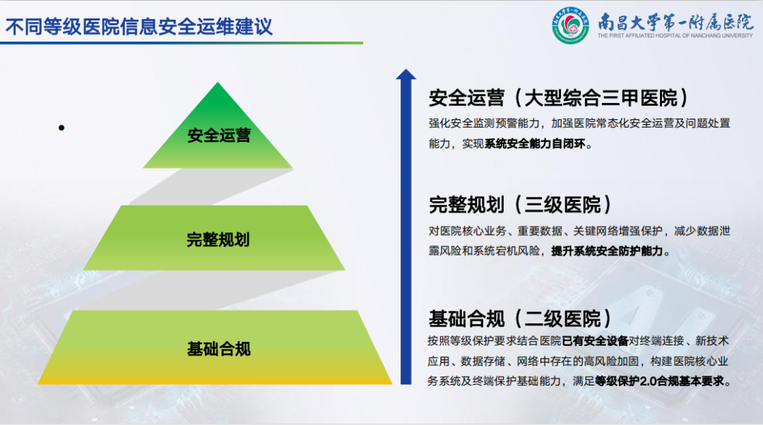 不同等级医院信息化建设需求不同,安全运维重点也有所不同。例如:二甲及以下的医院完善基础网络安全建设,确保在业务边界和网络边界都有防火墙一类的防护设备,且应在服务端配备终端杀毒;三级及以上医院应结合信息化建设情况,持续完善等保建设,并关注安全服务/数据安全/态势感知这些新安全领域等。