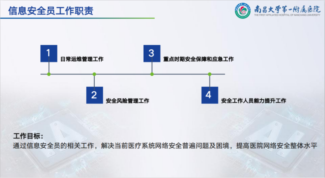 医院可以通过规范信息安全员的相关工作,解决当前医疗系统网络安全普遍问题及困境,提高医院网络安全整体水平。
