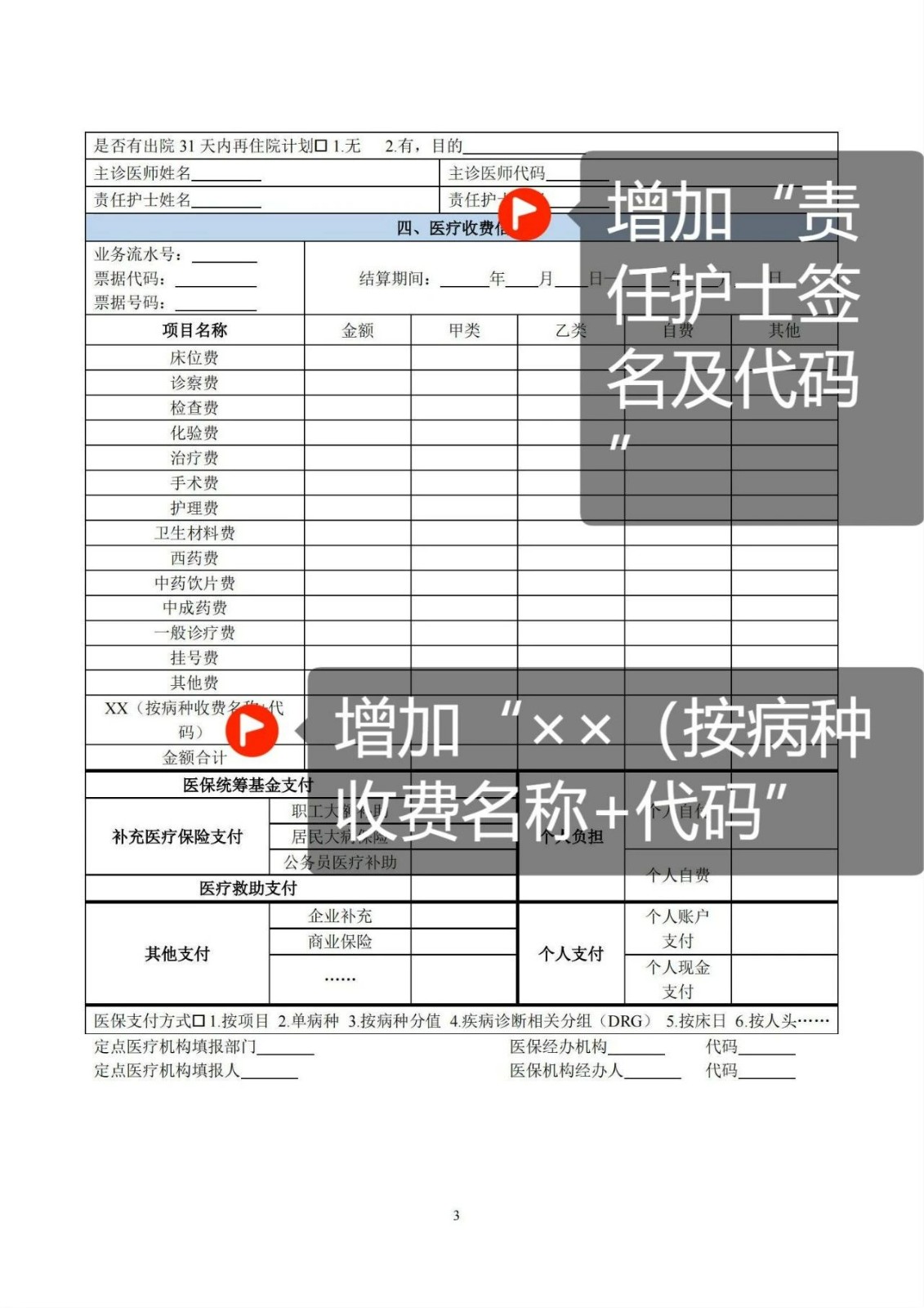 6.“XX(按病种收费名称+代码)”:为新增,指按病种(如:单病种、日间手术)向患者收费。原则上按病种付费的患者,无需填写“床位费、诊察费、检查费、化验费、治疗费、手术费、护理费、卫生材料费、西药费、中药饮片费、中成药费、一般诊疗费、挂号费、其他费”14项收费项目。