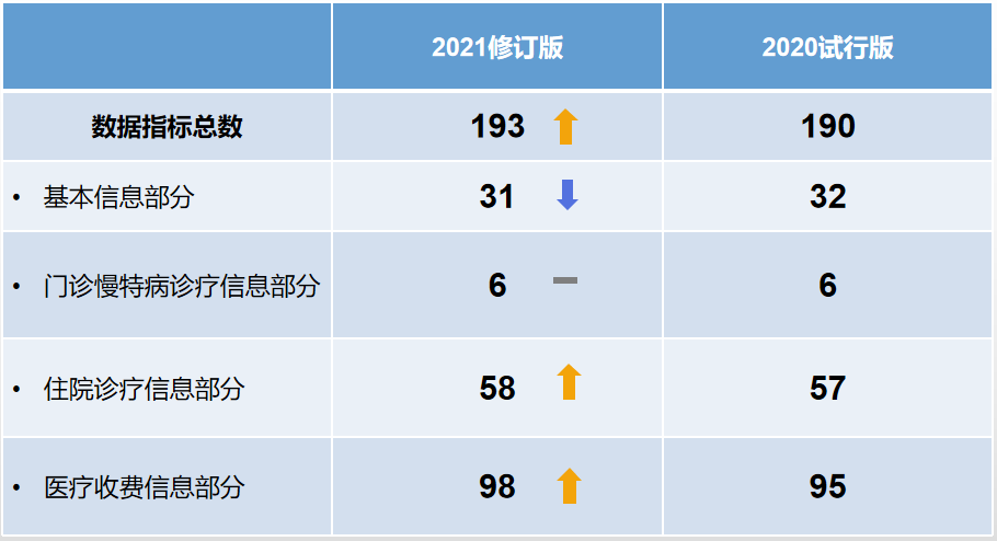 1.《规范修订版》基本信息第二条:医保结算清单数据指标共有193 项(原190项),其中基本信息部分31 项(原32项)、门诊慢特病诊疗信息部分 6 项、住院诊疗信息部分58项(原57项)、医疗收费信息部分 98 项(原95项)。