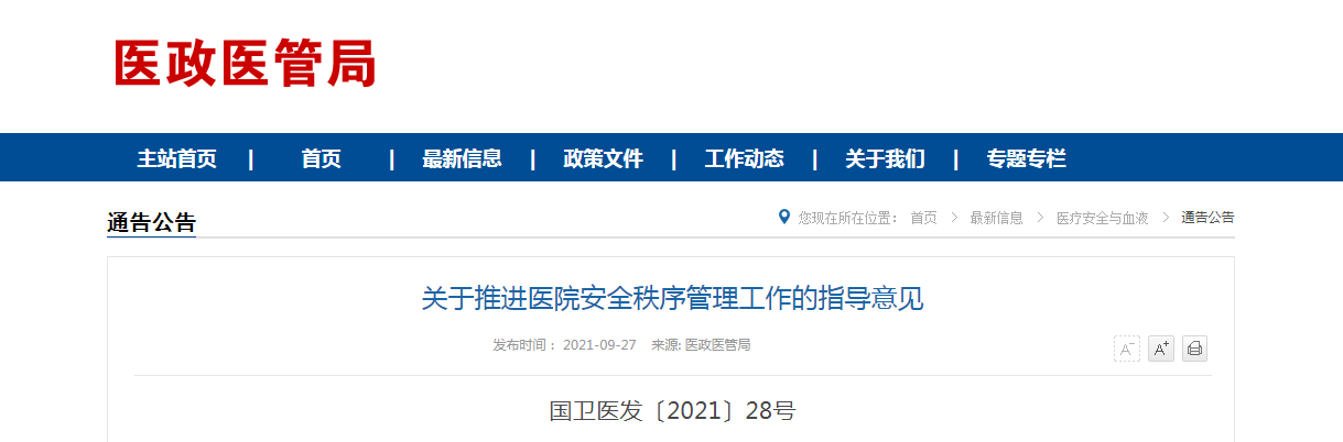 目前,医院安保工作形势依然严峻。为认真贯彻落实习近平总书记重要指示批示精神,进一步维护正常医疗秩序,保护医务人员人身安全,为医患双方营造良好诊疗环境,我委会同中央政法委、中央网信办、最高法、最高检、公安部、司法部、国家中医药管理局等部门,在充分调研、广泛征求意见的基础上,研究起草了《关于推进医院安全秩序管理工作的指导意见》。