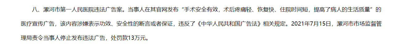 9月22日,漯河市第一人民医院被罚13万,原因是“涉嫌表示功效、安全性的断言或者保证,违反了《广告法》”。