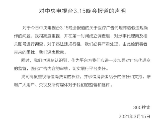 “315”晚会上,UC浏览器和360搜索被爆存在大量虚假医疗广告,成为百度之后被声讨的对象。