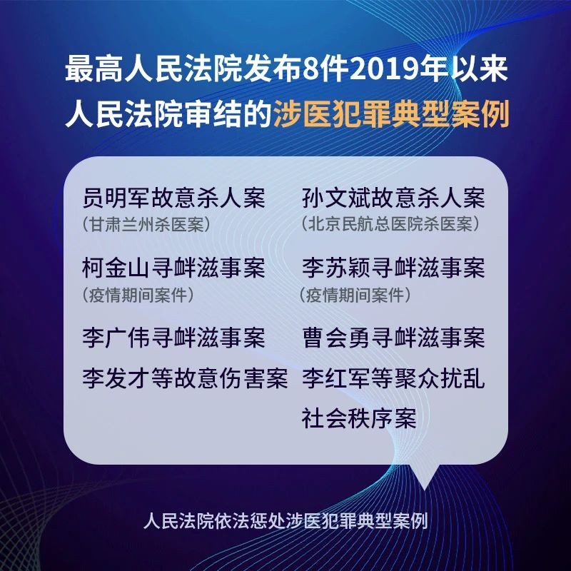 目录 1. 员明军故意杀人案 ——蓄意报复捅刺、砍击医生致死,罪行极其严重 2. 孙文斌故意杀人案 ——经预谋持刀杀害医生,罪行极其严重 3. 柯金山寻衅滋事案 ——疫情期间损坏医生防护用具、殴打医生致轻微伤 4. 李苏颖寻衅滋事案 ——疫情期间持注射器挟持护士致损伤 5. 李广伟寻衅滋事案 ——捅刺、殴打医务人员致1人轻伤、1人轻微伤 6. 曹会勇寻衅滋事案 ——殴打医务人员致1人轻伤,系累犯 7. 李发才等故意伤害案 ——殴打医生致轻伤 8. 李红军等聚众扰乱社会秩序案 ——聚众扰乱医疗机构秩序,情节严重 案例一 员明军故意杀人案 基本案情 被告人员明军,男,汉族,1976年5月20日出生,务工人员。2017年2月9日,被告人员明军到甘肃省兰州市五洲皮肤病医院治疗其鼻根两侧暗褐色沉着斑,该院皮肤科主任张某(被害人,女,殁年35岁)对其进行了色素分离、表浅电解术等治疗。一个疗程结束后,员明军自认为疗效不好并对其造成烧烫伤,要求医院赔偿并扬言报复。后由医疗纠纷人民调解委员会等进行调解,因员明军无端索要高额赔偿而未果。同年12月,员明军决意报复张某,并购买了作案工具尖刀、菜刀。2018年1月22日14时20分许,员明军携带刀具闯入五洲皮肤病医院张某的办公室,将门反锁,持尖刀朝张某胸背部等处连刺十余刀,在张某倒地后又持菜刀连续砍击张某颈部等处,致张某颈内外动脉、颈内静脉断裂及左肺静脉、双肺破裂大失血死亡。员明军作案后明知有人报警而在现场等候公安人员。 裁判结果 本案由甘肃省兰州市中级人民法院一审,甘肃省高级人民法院二审。最高人民法院对本案进行了死刑复核。法院认为,被告人员明军故意非法剥夺他人生命,其行为已构成故意杀人罪。员明军不能正确认识治疗效果,在索要高额赔偿未得到满足后蓄意报复,到医生办公室持尖刀、菜刀连续捅刺、砍击医生致死,犯罪情节恶劣,手段特别残忍,罪行极其严重,应依法惩处。员明军虽有自首情节,但综合其犯罪的事实、性质、情节和社会危害程度,不足以对其从轻处罚。据此,依法对被告人员明军判处并核准死刑,剥夺政治权利终身。罪犯员明军已于2020年5月9日被依法执行死刑。 典型意义 医学是复杂的生命科学,诊疗方案是医生基于医学知识作出的专业判断,患者对治疗效果要理性对待,不能仅因自认为治疗效果不佳就迁怒于医生甚至报复行凶。本案是一起患者因对治疗效果不满,经调解未果,报复杀害医生的典型案例。被告人员明军虽有自首情节,但其蓄意报复,在就诊近一年后携刀具到医生办公室连续捅刺、砍击医生致死,主观恶性深,罪行极其严重。人民法院依法对员明军判处死刑,体现了对此类犯罪的严惩。 案例二 孙文斌故意杀人案 基本案情 被告人孙文斌,男,汉族,1964年12月23日出生,无业。2019年11月12 日,被告人孙文斌之母(95岁)因患哮喘、心脏病、脑梗死后遗症等疾病到北京市第一中西医结合医院住院治疗,同月22 日出院。其间,医院曾下达病危病重通知书。同年12月4日,因孙母在家中不能正常进食,孙文斌联系999急救车将孙母送至北京市民航总医院。孙母经急诊诊治未见好转,被留院观察。孙文斌认为孙母的病情未好转与首诊医生杨某(被害人,女,殁年51岁)的诊治有关,遂对杨某怀恨在心。同月8日,孙文斌返回其暂住地取了一把尖刀随身携带,扬言要报复杨某,并多次拒绝医院对孙母做进一步检查和治疗。同月24日6时许,杨某在急诊科抢救室护士站向孙文斌介绍孙母的病情时,孙文斌突然从腰间拔出尖刀,当众持刀反复切割杨某颈部致杨某倒地,后又不顾他人阻拦,再次持刀捅刺杨某颈部,致杨某颈髓横断合并创伤失血性休克死亡。孙文斌作案后用手机拨打110报警投案。 裁判结果 本案由北京市第三中级人民法院一审,北京市高级人民法院二审。最高人民法院对本案进行了死刑复核。法院认为,被告人孙文斌故意非法剥夺他人生命,其行为已构成故意杀人罪。孙文斌因母亲就医期间病情未见好转,归咎并迁怒于首诊医生杨某,事先准备尖刀,预谋报复杀人,并在医院急诊科当众持刀行凶,致杨某死亡,犯罪动机卑劣,手段特别残忍,性质极其恶劣,社会危害性极大,罪行极其严重,应依法惩处。孙文斌虽具有自首情节,但不足以对其从轻处罚。据此,依法对被告人孙文斌判处并核准死刑,剥夺政治权利终身。罪犯孙文斌已于2020年4月3日被依法执行死刑。 典型意义 救死扶伤是医生的职责使命,但医学不是万能的,医疗效果并不总能满足患者和家属的期待。患者和家属首先应当积极配合医院进行治疗,同时也要正确认识病情和治疗效果,不能简单因病情未好转便归咎于医院和医生。本案是一起患者家属因患者病情未见好转而预谋报复杀害医生的典型案例,2019年年底案发后产生巨大且恶劣的社会影响。被告人孙文斌在将其年迈并患有多种严重疾病的母亲送到医院治疗期间,多次拒绝医院对其母进行检查和治疗,却认为其母病情未见好转与首诊医生的诊治有关,经预谋后在医院当众杀害首诊医生,犯罪性质极其恶劣,手段特别残忍,罪行极其严重。人民法院依法对孙文斌判处死刑,体现了坚决惩治暴力杀医犯罪的严正立场。 案例三 柯金山寻衅滋事案 基本案情 被告人柯金山,男,汉族,1979年1月15日出生,务工人员。2020年1月27日,被告人柯金山的岳父田某因疑似新型冠状病毒肺炎入住湖