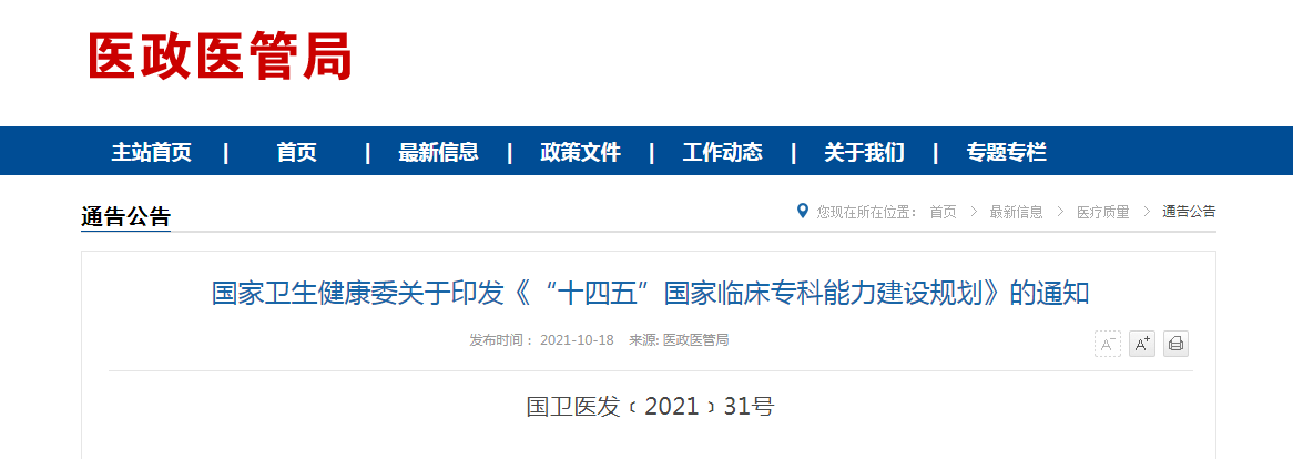 10月18日,国家卫生健康委医政医管局印发《“十四五”国家临床专科能力建设规划》的通知。