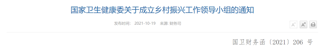 10月19日,国家卫生健康委关于成立乡村振兴工作领导小组的通知(国卫财务函〔2021〕206?号)印发。