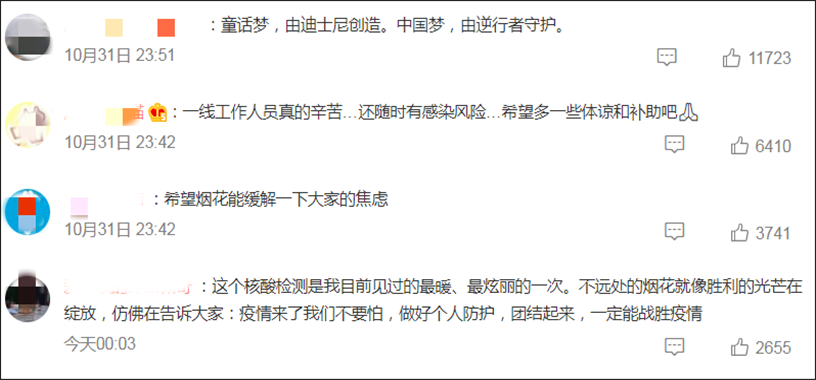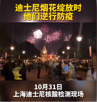 随后,一条视频火了:视频里上海迪士尼天空中绽放着美丽的烟花,而烟花下,是正在紧张进行着防疫工作的医护人员和排队等候核酸检测的游客们。