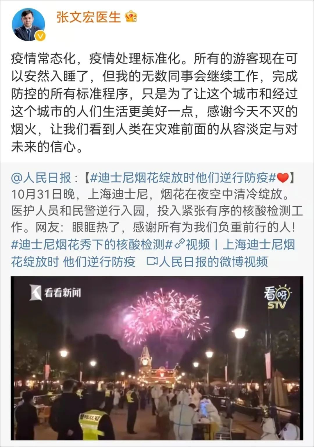 张文宏在微博上评论:“所有的游客现在可以安然入睡了,但我的无数同事会继续工作,完成防控的所有标准程序,只是为了让这个城市和经过这个城市的人们生活更美好一点,感谢今天不灭的烟火,让我们看到人类在灾难前面的从容淡定与对未来的信心。”