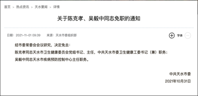 11月1日一早,天水党建网发布消息,经天水市委常委会会议研究,决定免去: