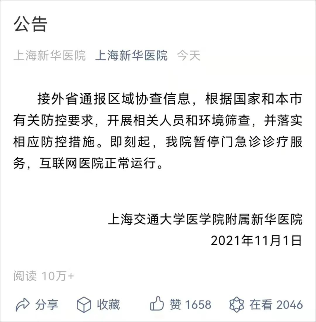 “上海新华医院”微信公众号11月1日凌晨发布公告:上海交通大学医学院附属新华医院发布公告,接外省通报区域协查信息,根据国家和本市有关防控要求,开展相关人员和环境筛查,并落实相应防控措施。即刻起,我院暂停门急诊诊疗服务,互联网医院正常运行。