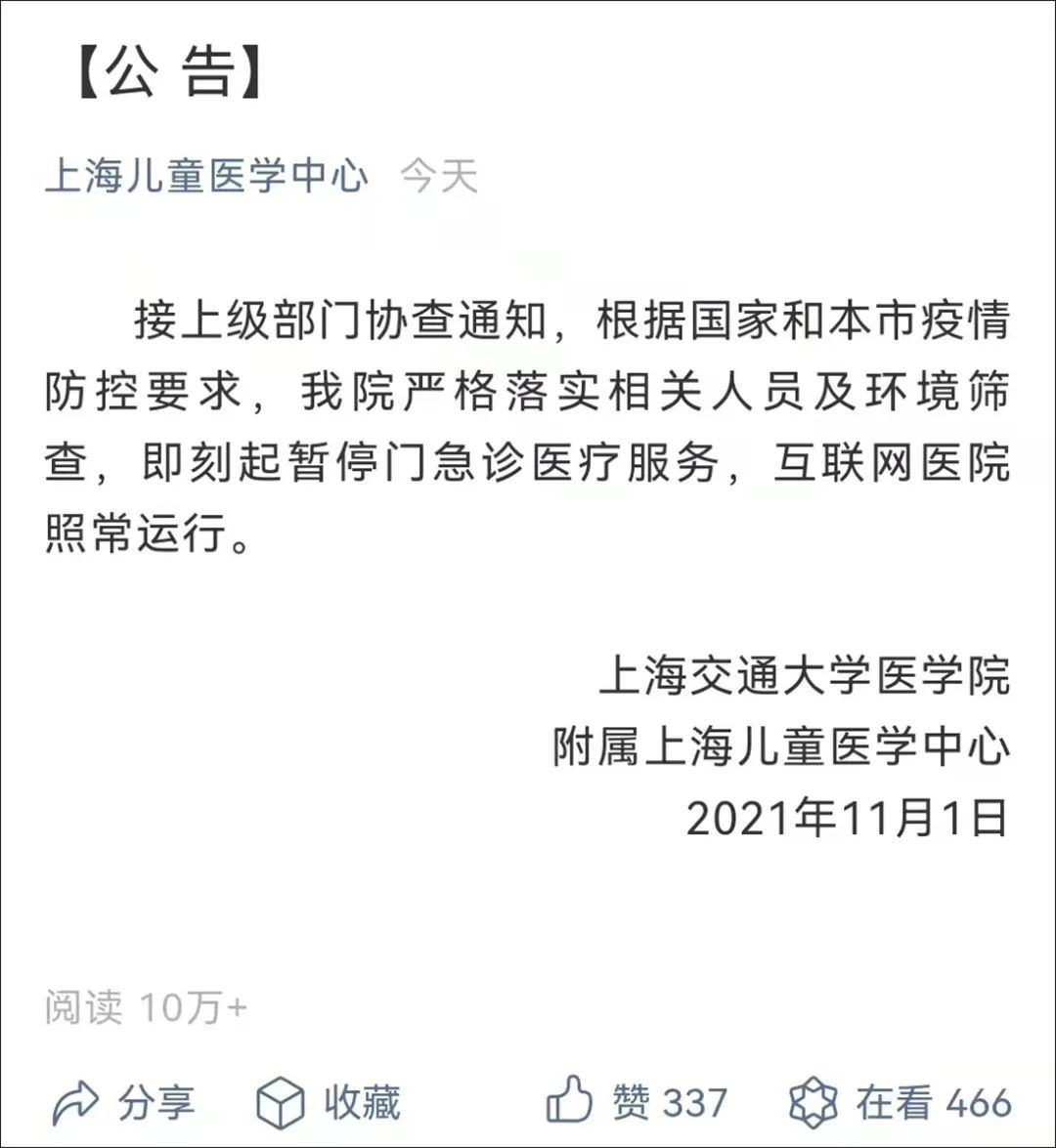 与此同时,上海交通大学医学院附属上海儿童医学中心11月1日一早发布公告:接上级部门协查通知,根据国家和本市疫情防控要求,我院严格落实相关人员及环境筛查,即刻起暂停门急诊医疗服务,互联网医院照常运行。