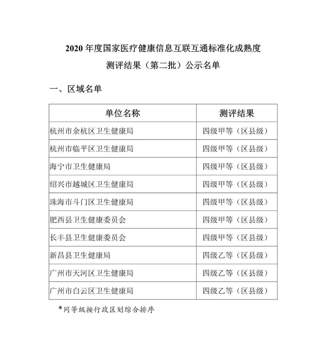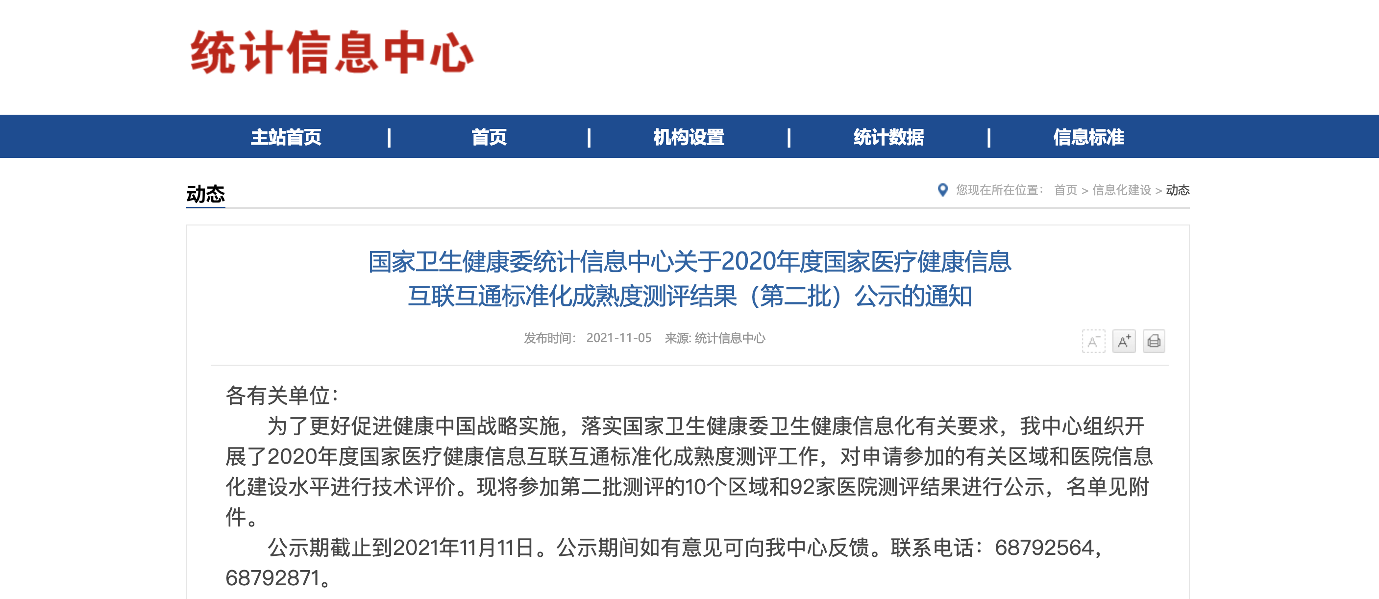 国家卫生健康委统计信息中心关于2020年度国家医疗健康信息互联互通标准化成熟度测评结果(第二批)公示的通知