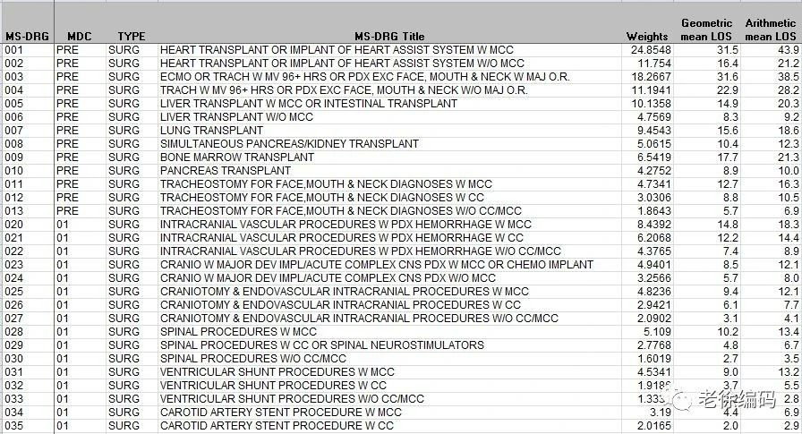 各病组的权重列表应该是公开的,但老徐目前尚未找到,在此放一张美国CMS的权重列表,大家先作参考。