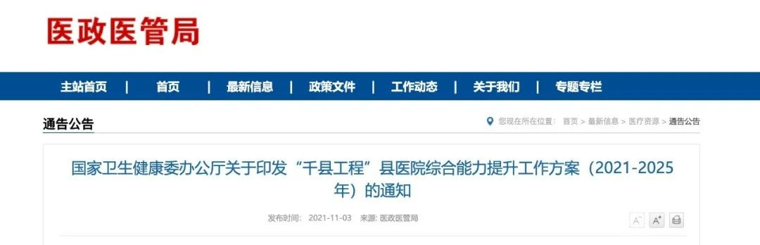 国家卫生健康委近日印发“千县工程”县医院综合能力提升工作方案(2021-2025年),推动省市优质医疗资源向县域下沉,逐步实现县域内医疗资源整合共享。方案提出,到2025年,全国至少1000家县医院达到三级医院医疗服务能力水平,发挥县域医疗中心作用,为实现一般病在市县解决打下坚实基础。