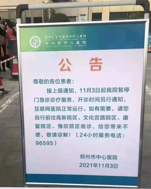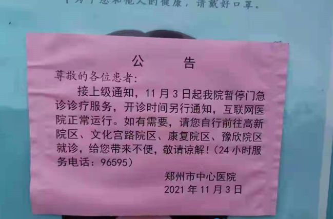 11月3日凌晨,位于郑州市中原区桐柏路上的郑州市中心医院突然停诊,医院门口公告牌上显示:接上级通知,暂停医院门急诊诊疗服务。