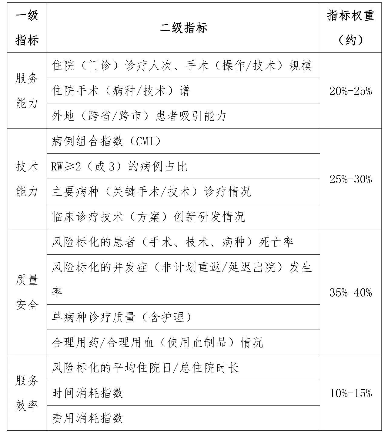 《国家临床专科能力评估通用指标》从医疗服务能力、技术能力、质量安全和服务效率4个维度考核评估医院临床专科能力,涉及临床专科的覆盖人群、服务频次、覆盖病种、资源消耗、诊疗质量等多个方面。其中,质量安全相关指标权重占比约为35%-40%,将成为影响临床专科能力综合指数最关键的因素。