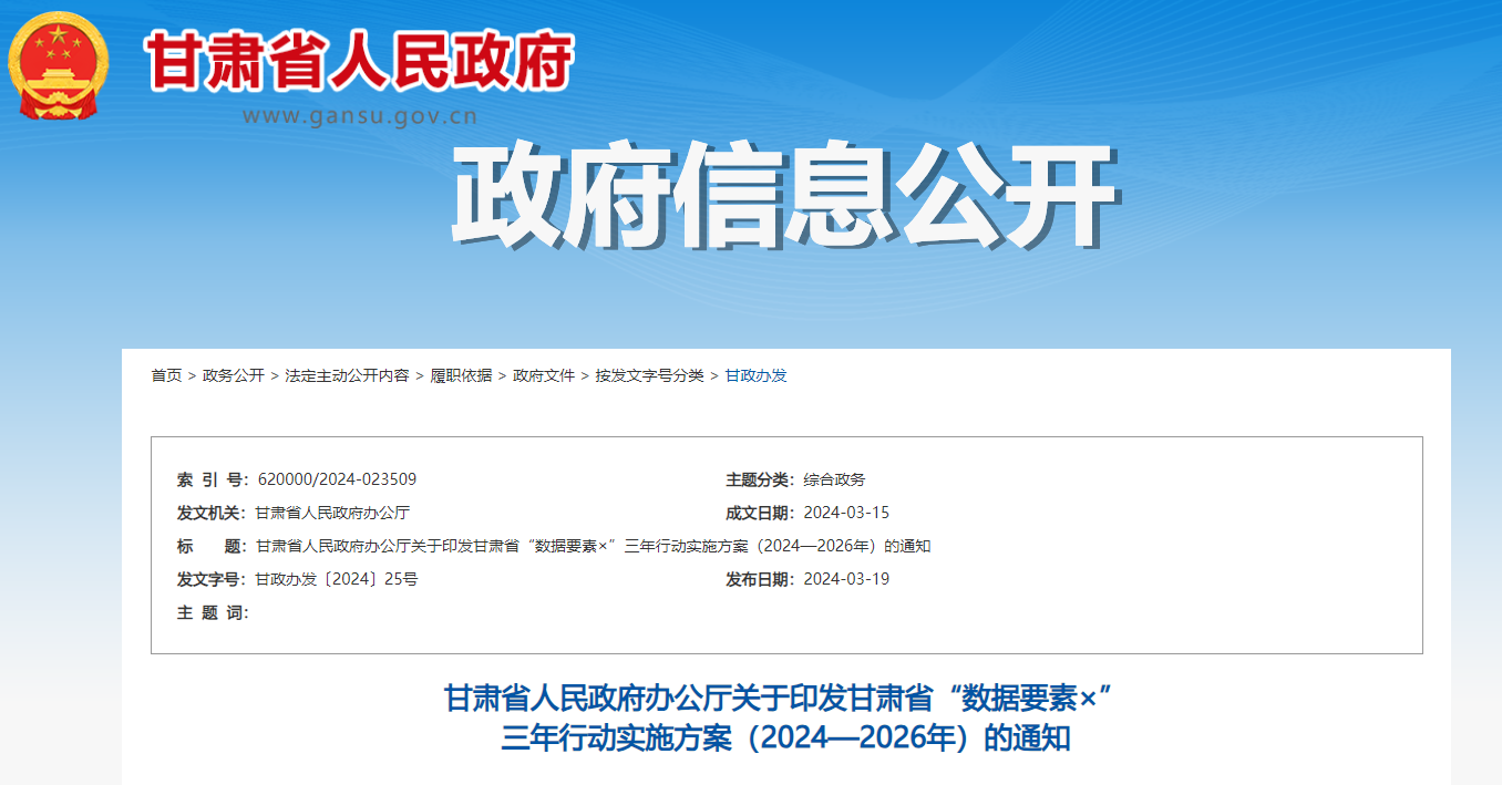 3月19日,甘肃省人民政府正式印发《甘肃省“数据要素×”三年行动实施方案(2024—2026年)》(下称《实施方案》),这是首个省级“数据要素×”三年行动实施方案。