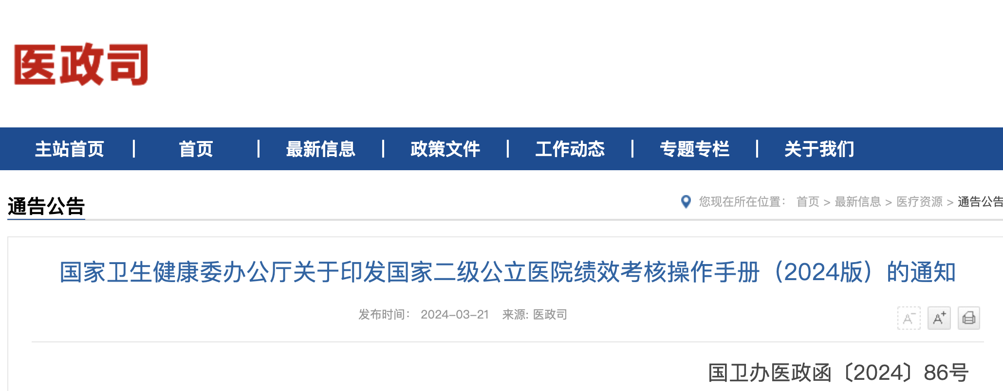 为持续提高二级公立医院绩效考核工作精细化水平,按照《关于加强二级公立医院绩效考核工作的通知》(国卫办医发〔2019〕23号)要求,根据实际工作需要和最新政策文件要求,我委对《国家二级公立医院绩效考核操作手册(2023版)》进行了修订完善,形成了《国家二级公立医院绩效考核操作手册(2024版)》(可从国家卫生健康委网站下载)。现印发给你们,请遵照执行。