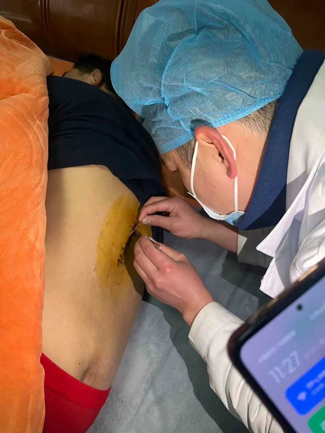 当天中午刘跃进就利用午休时间拎着药箱到访左先生家中。在仔细查看伤口确认可以拆线后,刘跃进弯着腰为躺在床上的左先生换药,取下伤口敷料、消毒、起钉拆线、包扎,很快就完成了操作。