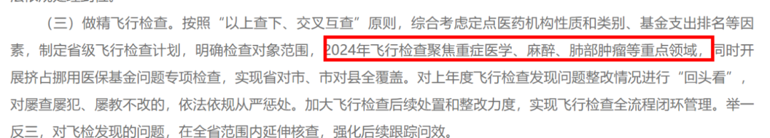 值得关注的是,《方案》还明确了2024年飞行检查重点领域:聚焦重症医学、麻醉、肺部肿瘤等重点领域,开展挤占挪用医保基金问题专项检查,实现省对市、市对县全覆盖。