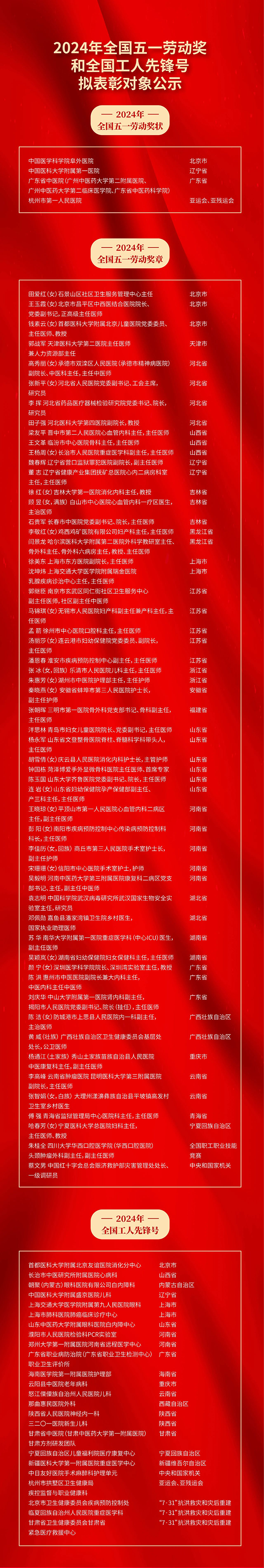 根据全国总工会日前于官网发布的《2024年全国五一劳动奖和全国工人先锋号拟表彰对象公示》,以及审查和公示结果整理了卫生健康行业的表彰名单,如下图所示(粗略统计)。