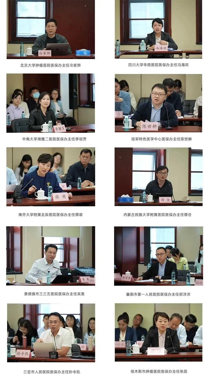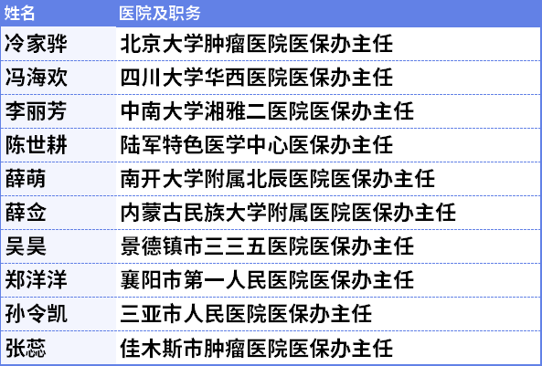 4月19日,座谈会参会者为北京大学肿瘤医院等10家医院医保办负责人。华西医院、湘雅二医院相关负责人虽然没有参加前两场座谈会,但其医保办负责人在第三场座谈会出席,“北协和、南湘雅、西华西”基本上都参加了本次座谈会。当然,并不只有知名医院,还有很多是“非知名”但同样兢兢业业为民众健康服务的医院,其具体名单为: