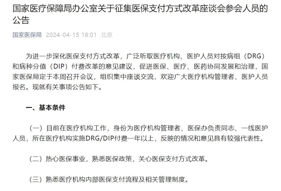 4月9日至10日,国家医保局连续两天发文,五谈支付改革,回应医疗机构、医生对这一模式的疑虑和担忧。4月15日,国家医保局发布公告,宣布将于4月17至4月20日,在4天内连开五场座谈会,就DRG/DIP付费改革相关问题,邀请医疗机构管理者、医护人员参加座谈会。报名方式以个人自荐方式报名,并得到所在单位的同意。