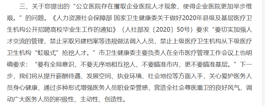 据山东济南市卫健委网站4月23日消息,济南市卫健委近期答复市第十八届人大三次会议人大代表侯艳关于“公立医院存在攫取企业医院人才现象”等问题的建议称,济南市卫健委主要负责人已明确要求:“不要无序地相互挖人,不要瞄准市内,更不要瞄准基层”。
