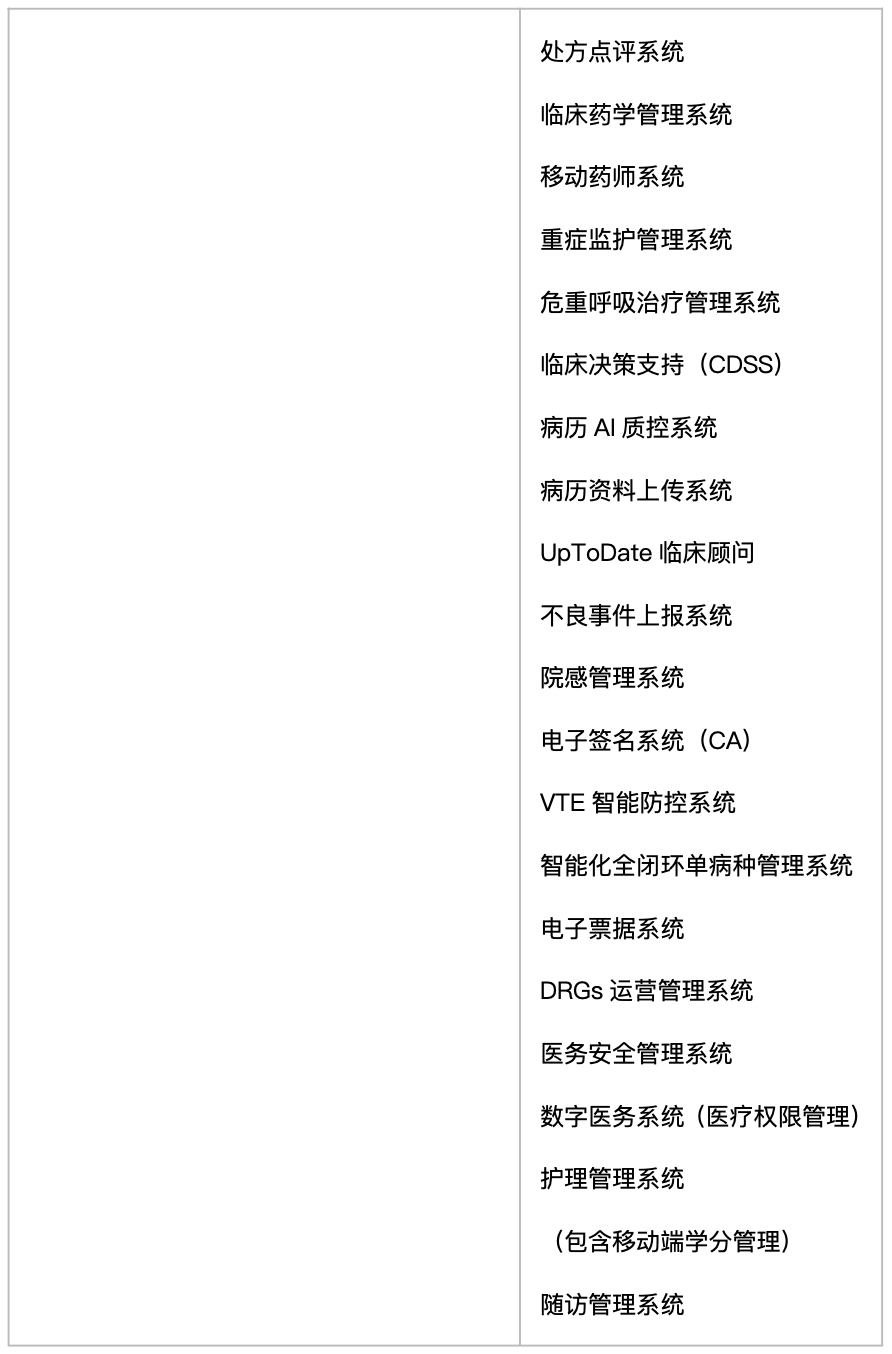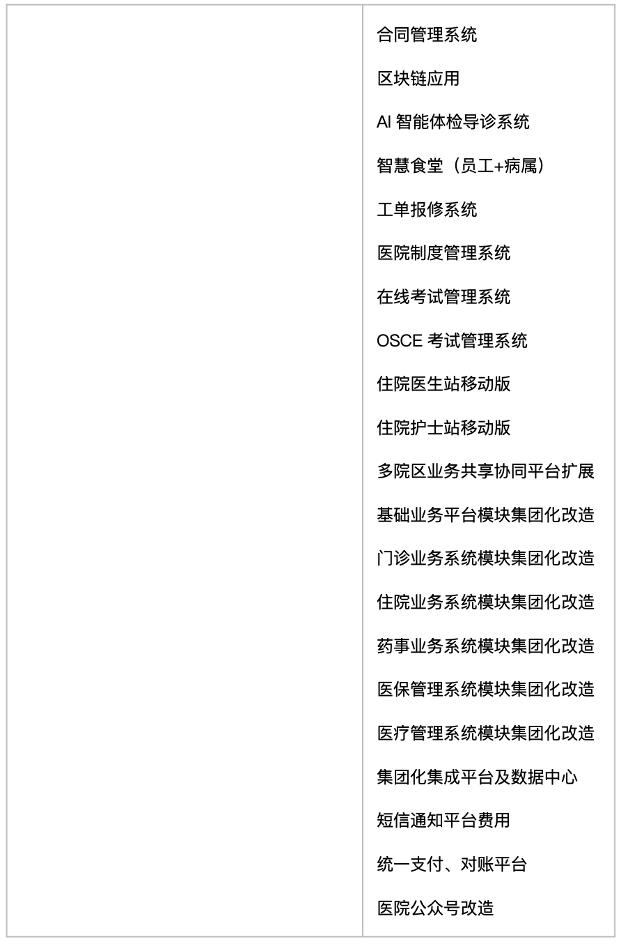 重症监护管理系统、危重呼吸治疗管理系统、临床决策支持(CDSS)、病历AI质控系统、病历资料上传系统、UpToDate临床顾问、不良事件上报系统、院感管理系统、电子签名系统(CA)、VTE智能防控系统、智能化全闭环单病种管理系统、电子票据系统、DRGs运营管理系统、医务安全管理系统、数字医务系统(医疗权限管理)、护理管理系统(包含移动端学分管理)、随访管理系统、合同管理系统、区块链应用、AI智能体检导诊系统、智慧食堂(员工+病属)、工单报修系统、医院制度管理系统、在线考试管理系统、OSCE考试管理系统、住院医生站移动版、住院护士站移动版、多院区业务共享协同平台扩展、基础业务平台模块集团化改造、门诊业务系统模块集团化改造、住院业务系统模块集团化改造、药事业务系统模块集团化改造、医保管理系统模块集团化改造、医疗管理系统模块集团化改造、集团化集成平台及数据中心、短信通知平台费用。