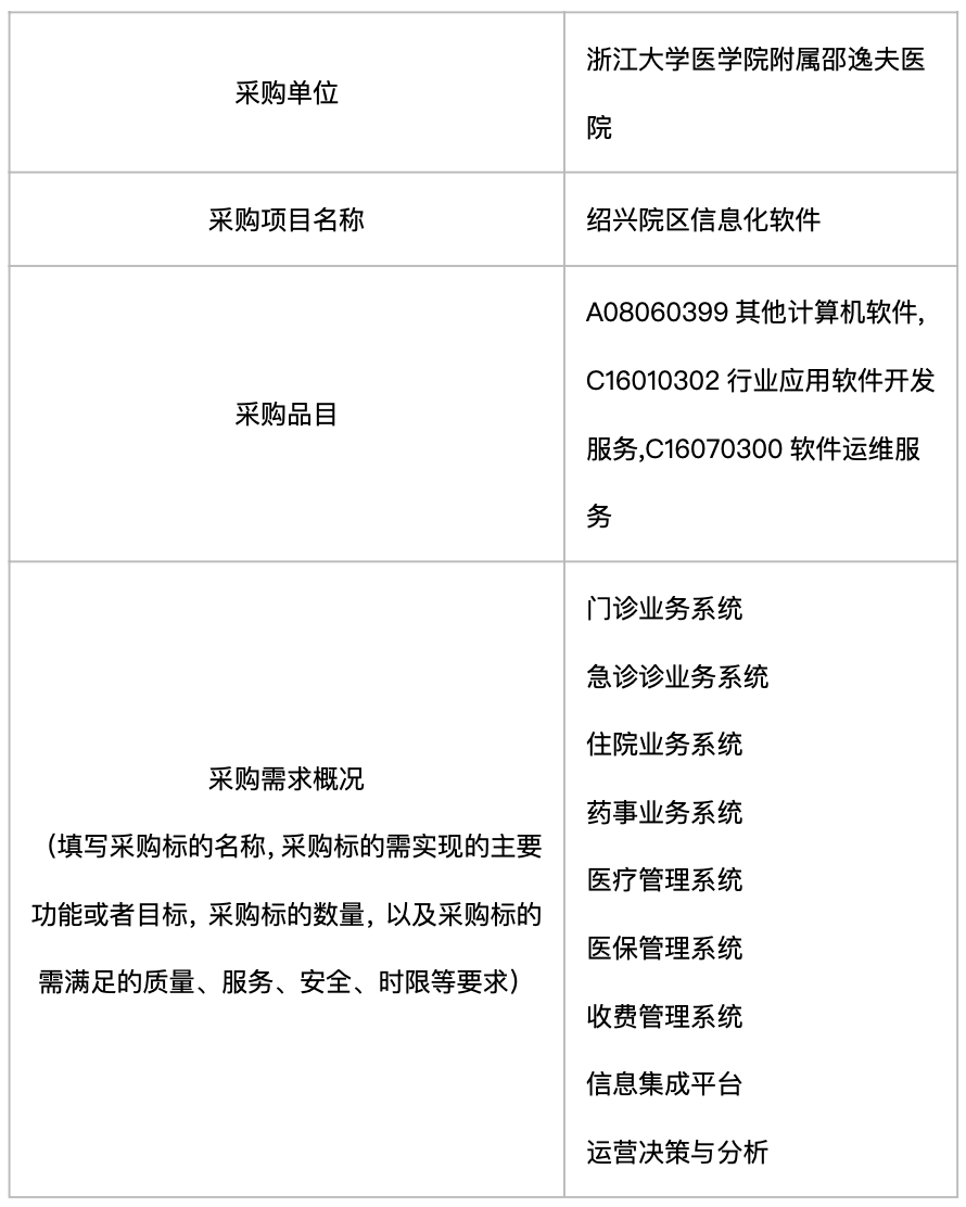 2024年4月30日,浙江大学医学院附属邵逸夫医院发布《2024年4月绍兴院区信息化软件政府采购意向》。