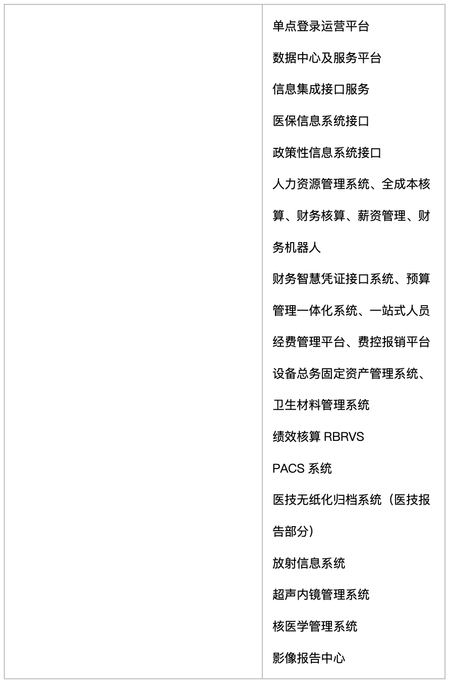 门诊业务系统、急诊诊业务系统、住院业务系统、药事业务系统、医疗管理系统、医保管理系统、收费管理系统、信息集成平台、运营决策与分析、单点登录运营平台、数据中心及服务平台、信息集成接口服务、医保信息系统接口、政策性信息系统接口。