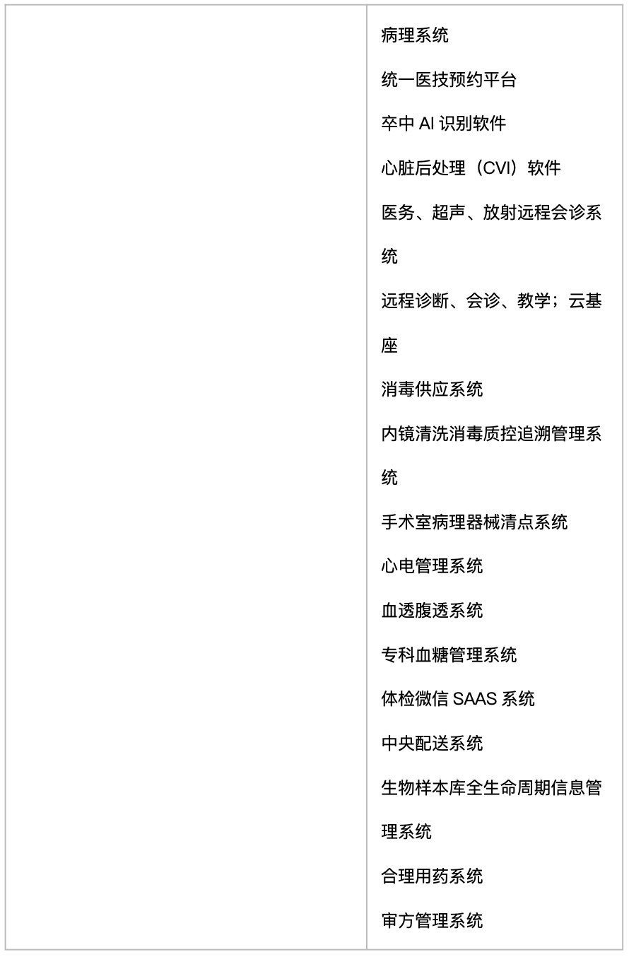 医技无纸化归档系统(医技报告部分)、放射信息系统、超声内镜管理系统、核医学管理系统、影像报告中心、病理系统、统一医技预约平台、卒中AI识别软件、心脏后处理(CVI)软件。