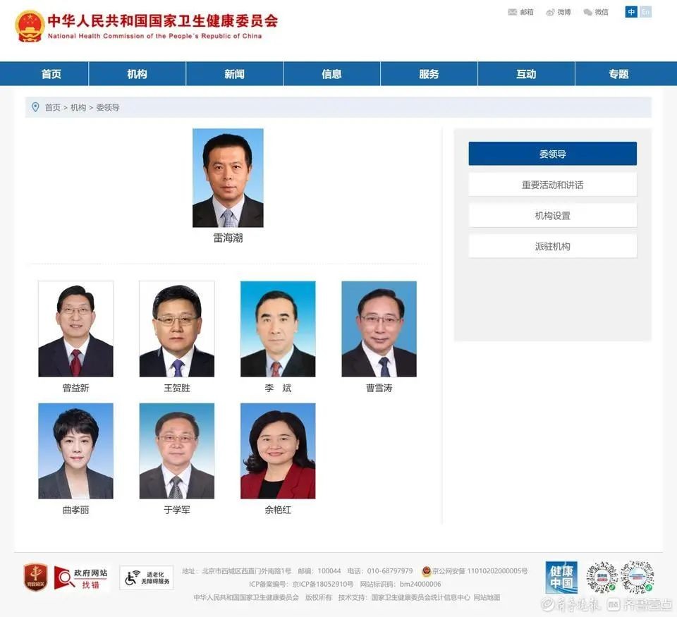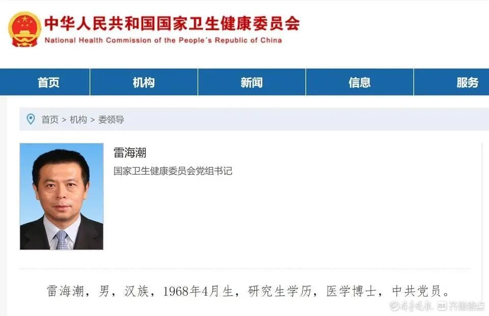 国家卫生健康委员会网站5月6日信息显示,雷海潮已任国家卫健委党组书记。