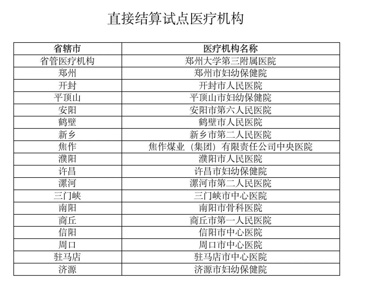 河南公布直接结算试点医院名单