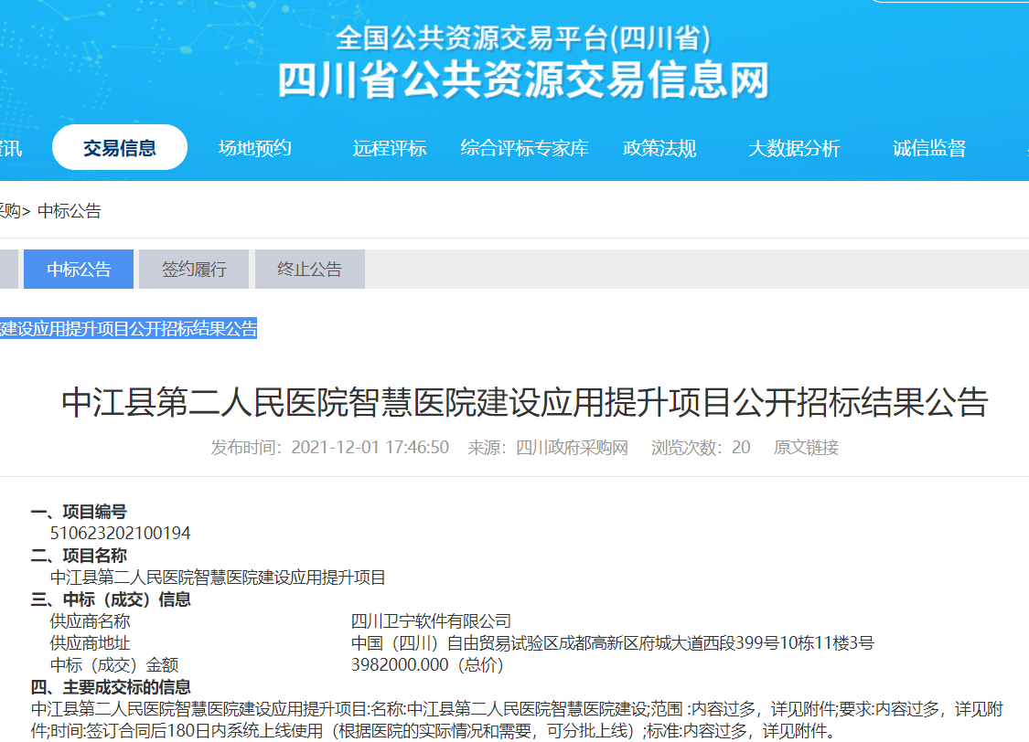 公开资料显示,中江县第二人民医院智慧医院建设应用提升项目的中标供应商为上市公司卫宁健康全资控股的四川卫宁软件有限公司,该项目预算金额为400万元。